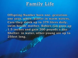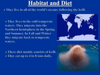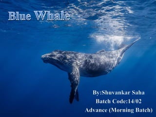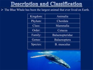 The Blue Whale is the largest animal ever known to have lived on Earth. It can grow up to over 100 feet long and weigh around 200 tons, feeding mainly on krill. Blue Whales were heavily hunted for their blubber and oil until 1966, bringing the species close to extinction before laws were passed banning commercial whaling and protecting the Blue Whale population.