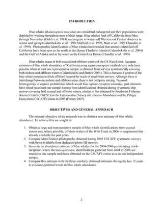 This document provides a final report on estimating the abundance of blue whales off the US West Coast using photo identification from 2004-2006. 481 unique blue whales were identified from coastal surveys during this period. Additionally, 38 whales were identified from broad-scale ship surveys and 7 from fine-scale surveys. Mark-recapture analysis estimated the blue whale population at 2,842, higher than previous estimates, though with high uncertainty. Abundance estimates using different methods tended to increase over time, though fluctuated substantially.