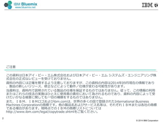 Corporation 2 IBM Bluemix www.bluemix.net ご注意 この資料は日本アイ・ビー・エム株式会社および日本アイ・ビー・エム システムズ・エンジニアリング株 式会社の正式なレビューを受けておりません。 資料の内容には正確を期するよう注意しておりますが、この資料の内容は2014年09月現在の情報であり 、製品の新しいリリース、修正などによって動作/仕様が変わる可能性があります。 当資料は、資料内で説明されている製品の仕様を保証するものではありません。従って、この情報の利⽤ またはこれらの技法の実施はひとえに使⽤者の責任において為されるものであり、資料の内容によって受 けたいかなる被害に関しても⼀切の補償をするものではありません。 また、IBM、IBMロゴおよびibm.comは、世界の多くの国で登録されたInternational Business Machines Corporationの商標です。他の製品名およびサービス名等は、それぞれIBMまたは各社の商標 である場合があります。現時点でのIBMの商標リストについては http://www.ibm.com/legal/copytrade.shtmlをご覧ください。