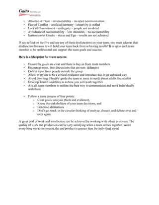 This document outlines the principles of effective teamwork, emphasizing the importance of trust, clear goals, and open communication. It identifies five dysfunctions of a team that hinder success and provides a blueprint for creating a cohesive team environment. The focus is on collaboration, accountability, and support to achieve collective results rather than individual accolades.