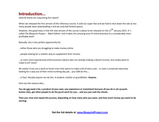 This document provides an overview of a course called The Blueprint Project - Black Edition, which teaches methods for making money online through e-commerce websites. It describes a 5-step process: 1) Finding markets with products people are already buying using their "Discover Niches" tool, 2) Evaluating markets using their "Keyword Blueprint" tool to find opportunities with low competition, 3) Sourcing products and suppliers using their "Dropship Blueprint" tool, 4) Building e-commerce stores using their push-button software, and 5) Getting free traffic using their traffic generation techniques. It claims students have made thousands of dollars per day and grown million-dollar businesses using these methods, which the course will teach in full detail