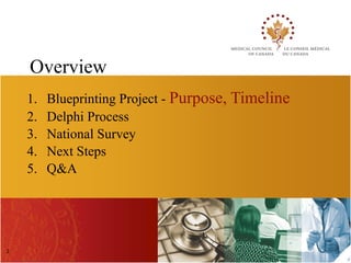 The document summarizes the blueprinting project of the Medical Council of Canada (MCC) to define and validate the critical competencies assessed in MCC examinations. It provides an overview of the project timeline and phases, which include a Delphi process using subject matter experts to reach consensus on objectives, a national survey, and revising examination blueprints. The next steps outlined are completing phase 1 and transitioning to operationalizing the new blueprints.