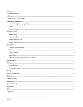This document provides details about the design of an ROV called Betngana created by the company Blue ROVotics for the 2016 MATE ROV competition. Some key points: