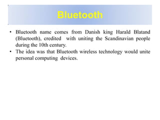 Bluetooth is a wireless technology standard that was created in 1998 to provide wireless connectivity between devices over short distances. It uses short-wavelength UHF radio waves in the ISM band from 2.4 to 2.485 GHz and employs frequency hopping spread spectrum technology to enable communication between multiple devices. Bluetooth devices can operate in piconets with one master device and up to seven active slave devices, and multiple piconets can be joined together to form scatternets. Bluetooth supports both synchronous voice links and asynchronous data links between devices.