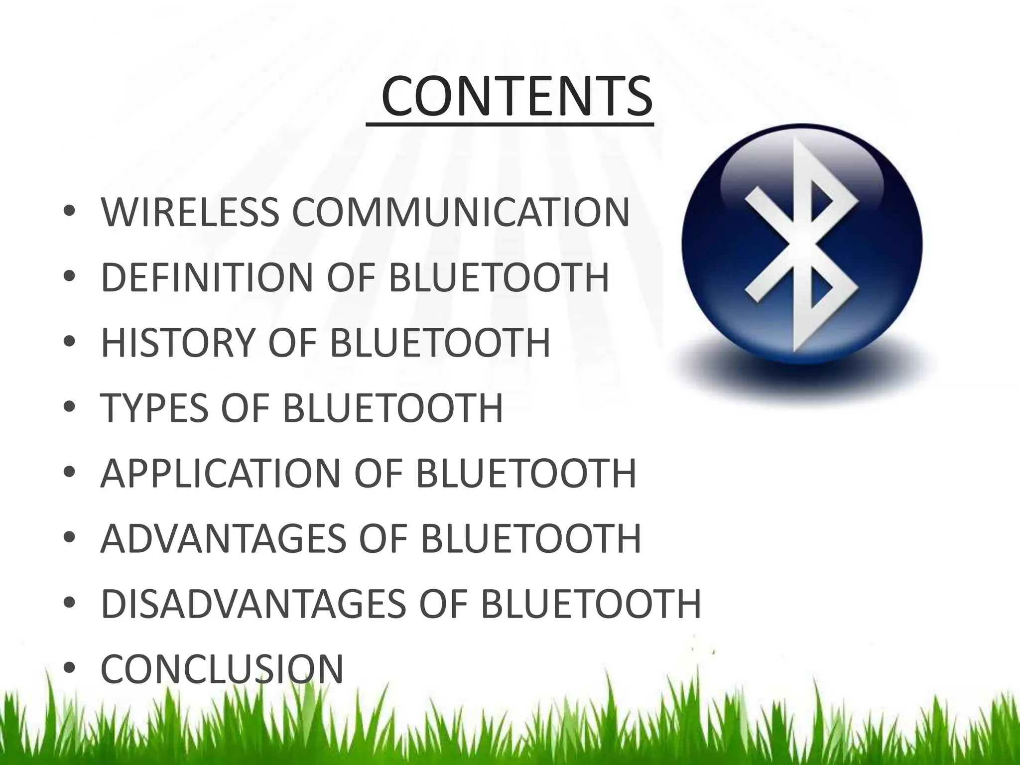 This document discusses Bluetooth technology. It defines Bluetooth as a short-range wireless protocol for exchanging data between fixed and mobile devices. The document outlines the history of Bluetooth's development starting in 1994 by Ericsson, its various applications including wireless headsets and file transfer between devices, and advantages like low cost and reduced wires compared to disadvantages like short range and potential security issues.