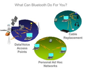 Bluetooth is a wireless technology standard for exchanging data over short distances using short-wavelength UHF radio waves in the industrial, scientific and medical radio bands. It allows for connection between devices like computers, phones, keyboards, printers, headsets within a range of about 10 meters. Bluetooth operates using a frequency-hopping spread spectrum in the 2.4 GHz band to avoid interference and jamming. Up to eight devices can be connected in a piconet, with one device acting as the master and up to seven acting as slaves. Multiple piconets can be further connected to form a scatternet, allowing for many more than eight devices to be connected together. Bluetooth is commonly used for hands-free calling, file