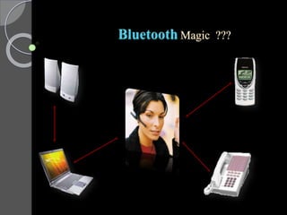 Bluetooth is a short-range wireless technology that was developed in 1994 to provide wireless connections between devices like mobile phones, laptops, and other electronics. It uses radio waves in the 2.4 GHz range to connect up to 8 devices within 10-100 meters of each other. While initially developed for replacing cables, Bluetooth has expanded to many applications and is now commonly included in devices like headphones, speakers, and wireless keyboards.