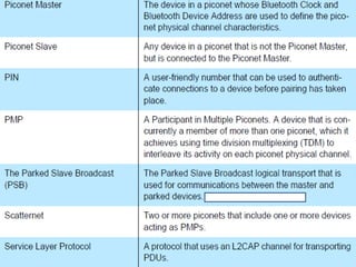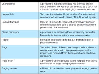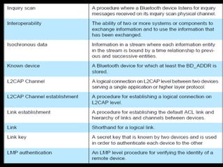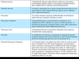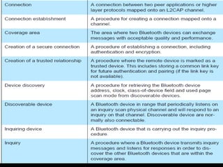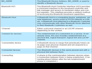 The document discusses the history and technology of Bluetooth and infrared wireless communication. It describes how Bluetooth was developed in Scandinavia in the 1990s to connect devices wirelessly like computers and printers. Bluetooth uses short-range radio transmission at 2.4GHz to connect up to 7 devices within a 10-100 meter range. Infrared technology also enables wireless connectivity up to 1 mile using line-of-sight transmission in the terahertz frequency range, and has applications in local area networks and banking. Both technologies allow devices to communicate without wires but Bluetooth has now become more widely used.