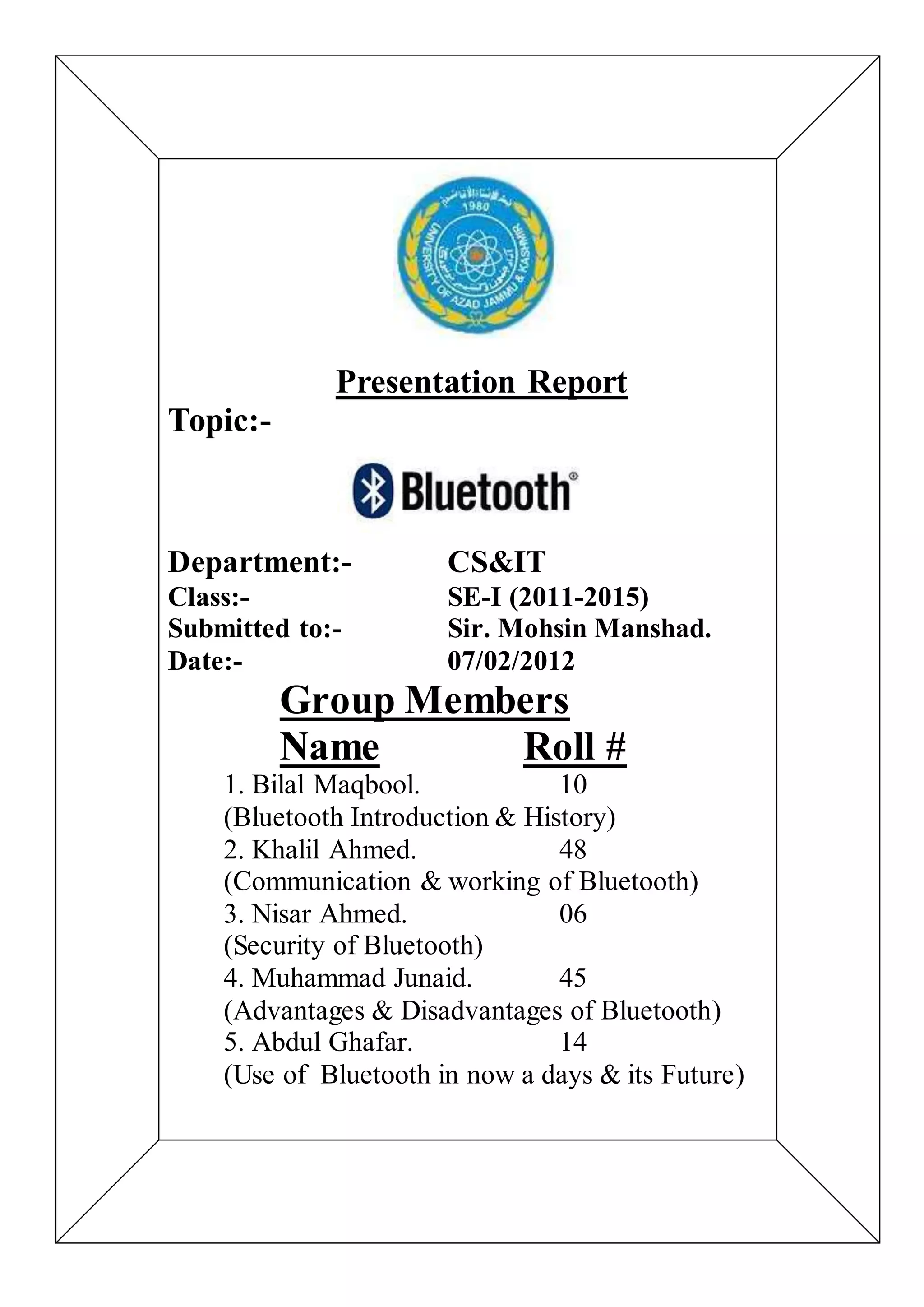 This presentation report summarizes a group presentation on Bluetooth technology. The report includes an introduction, contents listing, and sections on Bluetooth history, communication and connection, implementation, and key concepts. A group of 5 students presented on various aspects of Bluetooth, including its introduction and history, communication workings, security, advantages and disadvantages, current and future uses.