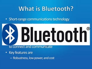 Bluetooth is a short-range wireless technology that allows various electronic devices such as computers, phones, and headphones to connect and communicate without wires. It operates in the unlicensed 2.4 GHz radio band and can connect up to 8 devices within a range of about 10 meters. Bluetooth was developed in 1994 by Ericsson to simplify connections between devices by replacing cables. It has since become widely adopted and integrated into many consumer electronic products.