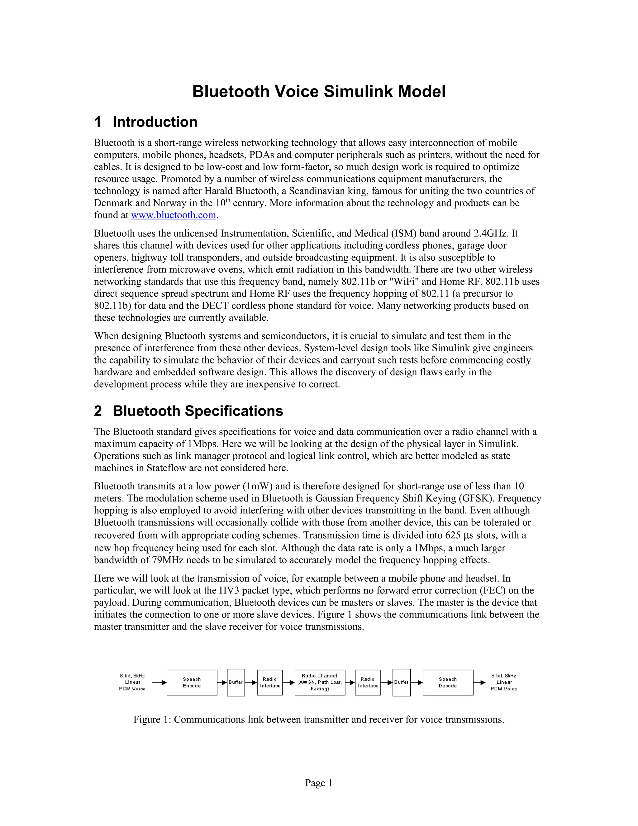 This document describes a Simulink model for simulating Bluetooth voice transmission. The model includes blocks for speech coding, framing, error checking, modulation, frequency hopping, and a channel model with interference. Tests are performed by running simulations with varying parameters and analyzing output metrics like bit error rate and frame error rate. The model allows testing the effects of noise, interference and other factors on Bluetooth transmission performance.