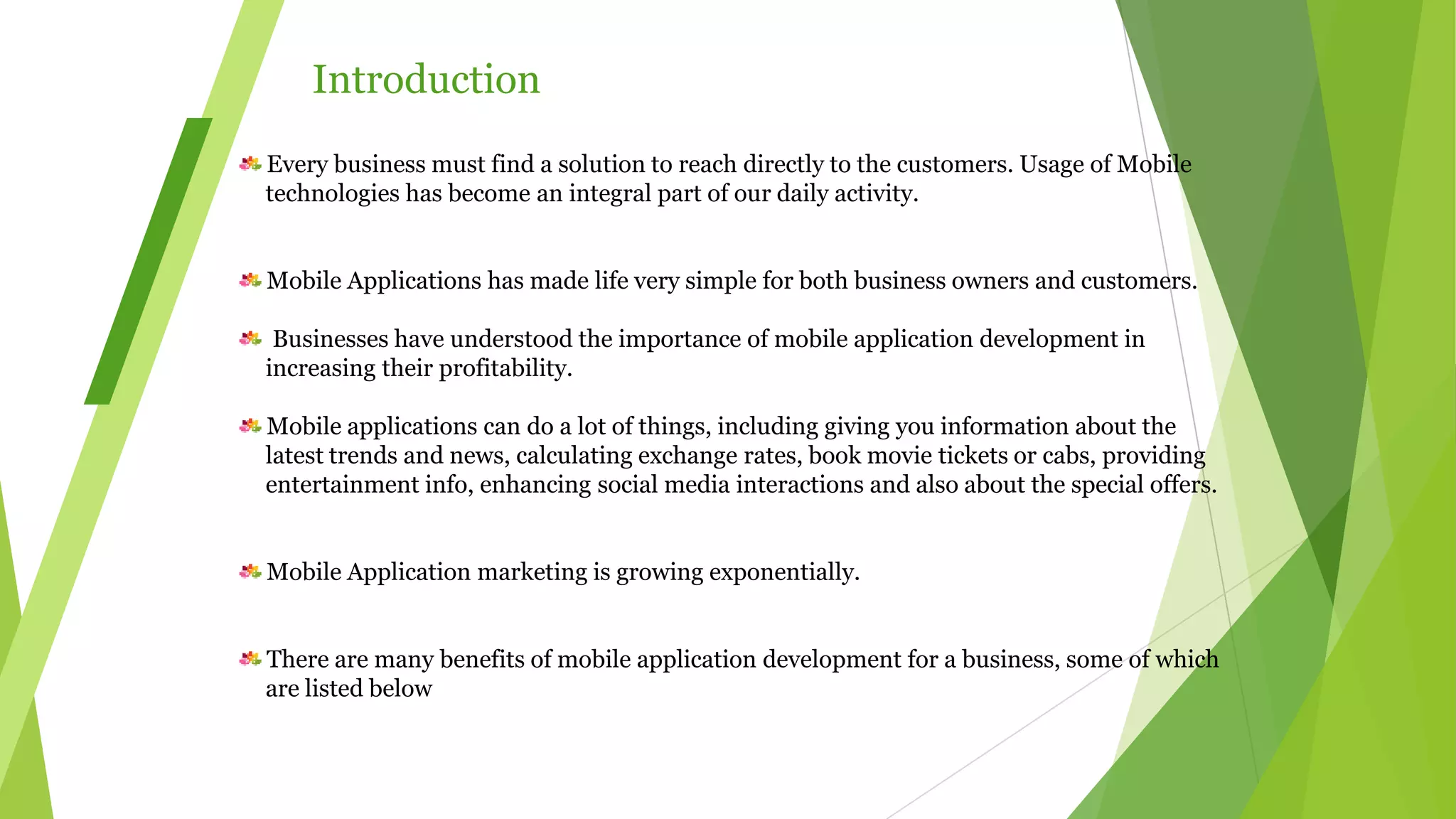 Mobile application development significantly enhances business profitability by improving brand visibility and customer engagement. Apps serve as a vital tool for promoting services, providing a seamless shopping experience, and increasing customer interaction. The document highlights that mobile apps are expected to generate substantial revenue, with many users engaging with them regularly.