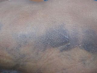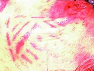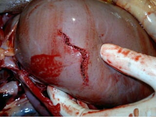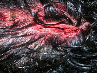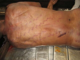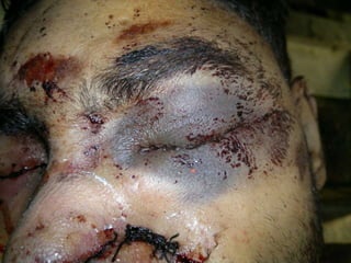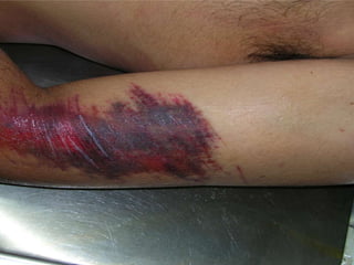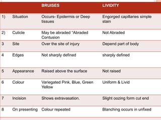 This document discusses various types of mechanical or physical injuries caused by blunt force, including abrasions, contusions, lacerations, and bruises. It provides classifications of injuries including based on causative factor (blunt force, sharp force, firearms, thermal, chemical), severity (simple, grievous, dangerous), and time of infliction (antemortem, postmortem, perimortem). Details are given on features, appearances, complications and medicolegal importance of specific injuries like abrasions, contusions, lacerations, and factors that affect bruise formation. The document also discusses concepts like patterned injuries, migratory bruises, and differences between ante- and postmortem injuries.