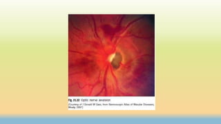This document summarizes various types of eye injuries resulting from blunt or penetrating trauma. It describes injuries to different parts of the eye including the eyelid, orbit, globe, cornea, iris, lens, vitreous, retina, and optic nerve. Specific injuries discussed include hyphema, commotio retinae, iridodialysis, traumatic cataract, retinal detachment, and increased intraocular pressure. Treatment approaches are provided for different injuries as well as potential complications. The document serves as a comprehensive reference for classifying and managing ocular trauma.