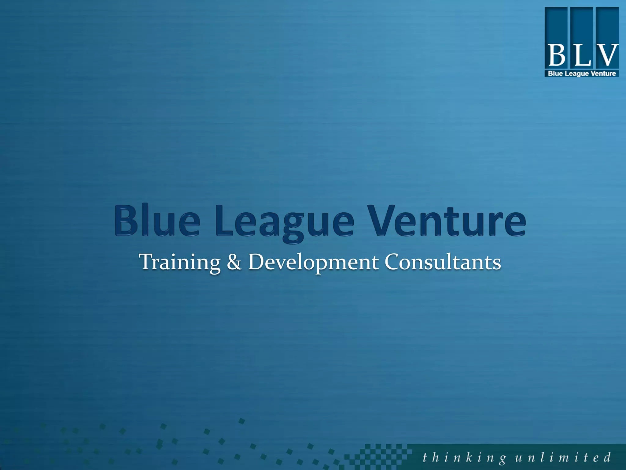 Blue League Venture is a training and development consultancy focused on today's market trends. It aims to address attrition and shortage of skilled workers. Studies show that soft skills like communication and problem solving are as important as technical skills for long term success. Blue League Venture offers soft skills and management training programs for entry-level, middle, and upper-level employees covering topics like communication, sales, problem solving, leadership, and teamwork. It works with clients to design customized training solutions and also handles delivery, materials, and evaluation. Blue League Venture works with companies across industries to provide strategic and effective training programs.
