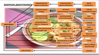 Документ содержит модель процесса производства жульена, включая список необходимых ингредиентов и инструкции по приготовлению. Основные ингредиенты включают куриное филе, шампиньоны, лук, сливки, сыр и специи. Также представлены данные о стоимости ингредиентов и дерево целей IDEF0.
