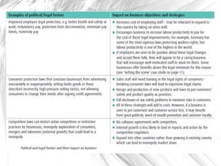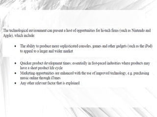 The document discusses how businesses are affected by factors in the external environment that are outside of their control, including political, economic, social, technological factors. It introduces the PEST analysis framework for examining the external environment and provides examples of how different external factors impact businesses and should be considered in their objectives and strategies. The document also gives specific examples analyzing how certain external and economic factors impact businesses.