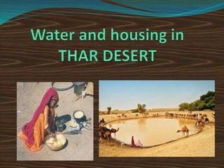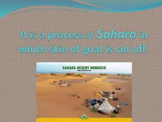 The Sahara desert is the largest subtropical desert in the world, spanning 9.4 million square kilometers of North Africa. The Thar desert, located in India and Pakistan, is the 9th largest subtropical desert globally. Both deserts are characterized by extreme heat and aridity, with sand dunes and gravel plains shaped by wind. Vegetation in the Sahara and Thar has adapted to the harsh conditions through mechanisms like deep roots and water storage. Animal life in the Thar is diverse given the varied habitat, with many species like the blackbuck surviving through local protection and smaller size.