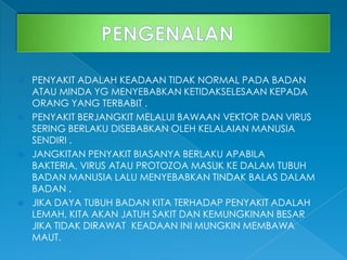 Penyakit adalah keadaan yang tidak normal pada tubuh atau minda yang boleh menyebabkan ketidakselesaan, terutama penyakit berjangkit yang ditularkan melalui vektor dan virus akibat kelalaian manusia. Pencegahan termasuk suntikan imunisasi, pengambilan antibiotik, dan pemeriksaan kesihatan berkala, serta amalan kebersihan dan gaya hidup sihat. Kesihatan adalah aset berharga dan kesedaran perlu ditingkatkan, terutama di kalangan generasi muda, untuk mengatasi risiko penyakit berjangkit.