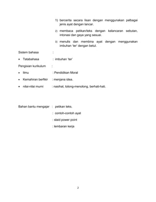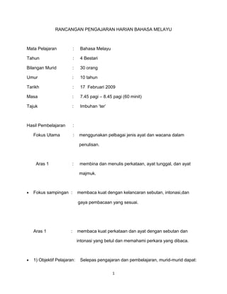 Rancangan pengajaran harian bahasa Melayu ini membahas pelajaran tentang imbuhan 'ter' untuk murid kelas 4. Pelajaran ini berfokus pada membangun dan menulis perkataan, ayat tunggal, dan majmuk menggunakan imbuhan tersebut. Aktivitas pengajaran dan pembelajaran meliputi contoh ayat, petikan teks, dan lembar kerja.