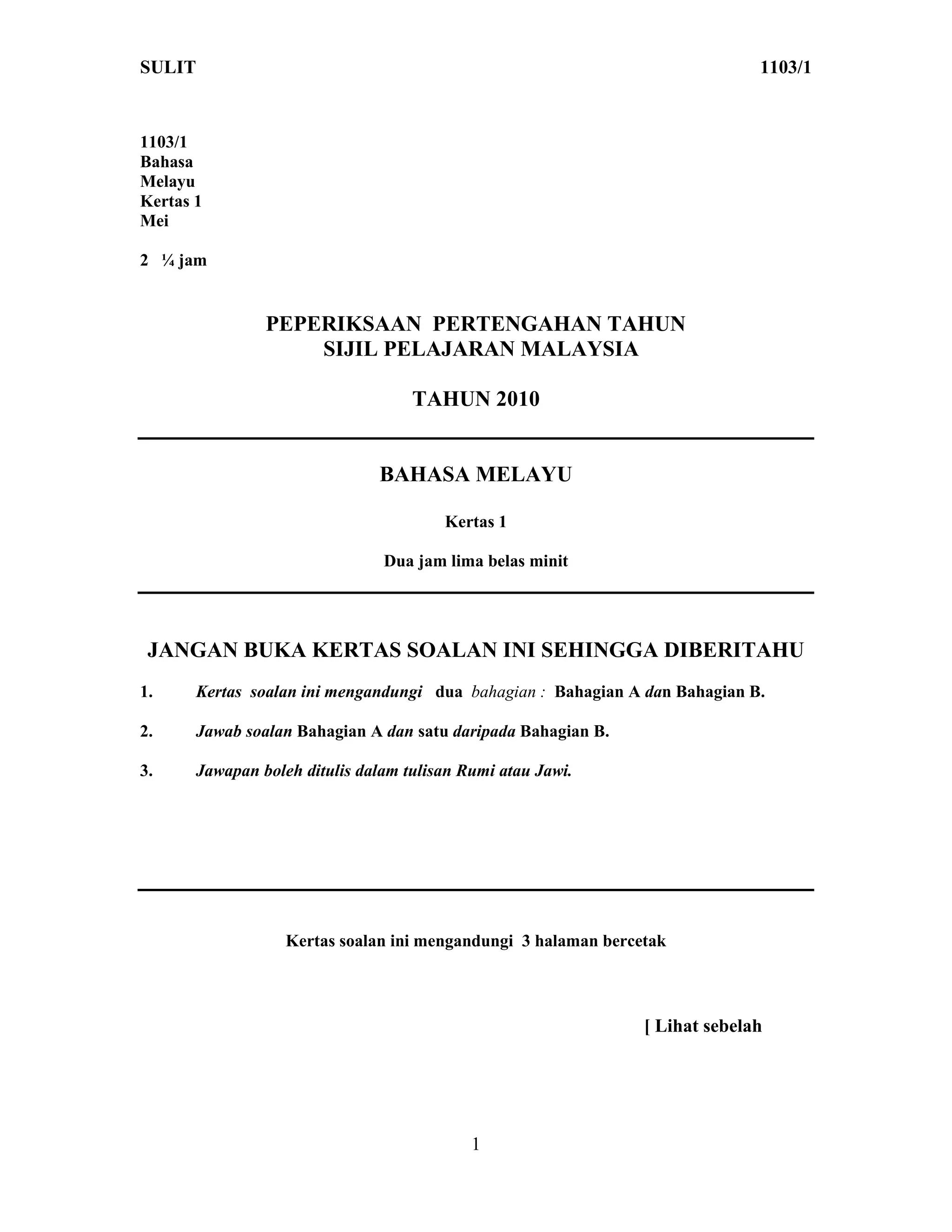 Dokumen ini adalah kertas soalan peperiksaan Bahasa Melayu Kertas 1 dan Kertas 2 untuk Sijil Pelajaran Malaysia tahun 2010. Ia mengandungi arahan mengenai bahagian dan soalan yang perlu dijawab, termasuk kebolehan calon dalam membina karangan dan penggunaan bahasa. Terdapat juga kriteria pemarkahan yang terperinci untuk menilai jawapan pelajar.
