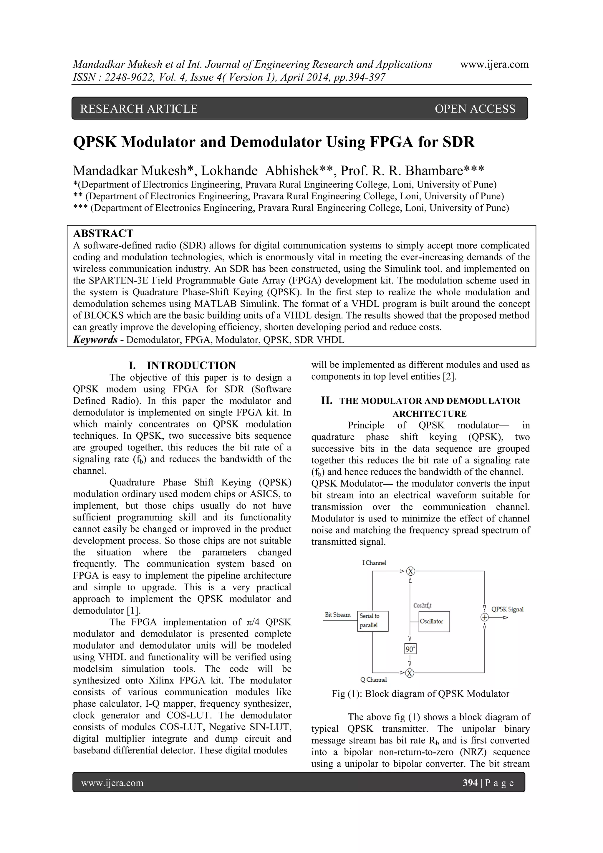This document outlines the design and implementation of a quadrature phase-shift keying (QPSK) modulator and demodulator using a field programmable gate array (FPGA) for software-defined radio (SDR) applications. It describes the construction process using MATLAB Simulink and VHDL coding, highlighting the efficiency and flexibility of FPGA in handling complex modulation techniques. The results indicate significant improvements in development efficiency and cost reduction while achieving reliable communication performance.