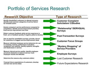 The document discusses various methods for conducting customer research and measuring service quality, including mystery shopping, customer surveys, focus groups, and employee surveys. It also covers frameworks for understanding customer relationships and loyalty, such as the customer pyramid model and relationship development model. Finally, it discusses strategies for developing new services, such as service blueprinting, and guaranteeing service quality.