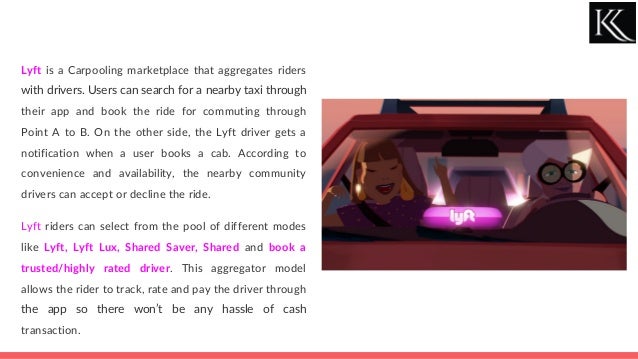 Lyft is a carpooling marketplace connecting riders and drivers, allowing users to book rides through its app, while enabling drivers to accept or decline requests based on convenience. The rise of smartphones and internet has fueled the demand for ride-sharing services, particularly in India, where the market is still developing and offers significant opportunities due to a growing urban population and milder regulations. Lyft's business model relies on building trust with drivers and leveraging technology to provide convenient, cost-effective rides for users while ensuring multiple revenue streams.