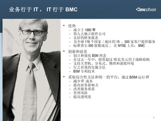 BSM 领导者 “BMC 是今天 BSM 的领导者 .” Forrester Research, “The BSM Bet Is Paying Off For BMC Software: SWOT Analysis: BMC Software, Q4 2007,” T. Mendel, December 2007 “ BMC 原创了 BSM 业务服务管理这一理念。作为企业和系统管理领域的老牌公司, BMC 勇于承担了开创一个新的领域并投入制造支撑这一理念的系列产品的风险。结果如何呢? BMC 成功打造了一个坚实可行的 BSM 整体解决方案,并提供了达成 BSM 的逐步计划。” Forrester Research, “BMC Software Aligns IT With The Business To Lead In Business Service Management: The Forrester Wave™ Vendor Summary,” P. O’Neill and E. Hubbert, March 2007 BMC 的优势在于:“连续 20 个月领先其他供应商 ( BMC Atrium CMDB 2.0 改善了模型化和 Definitive Software Library—— 这有力奠定了 BMC 的领导地位)。” Gartner Research, “IT Service View: CMDB Vendor Landscape,” R. Colville and P. Adams, Jun e 2007 “ 通过提升 BSM 业务服务管理在业界的认知度、重要性和前瞻性, BMC 正在引领这一愿景的实现。” (IDC, Fred Broussard, Research Manager, PC and Device Management Software)