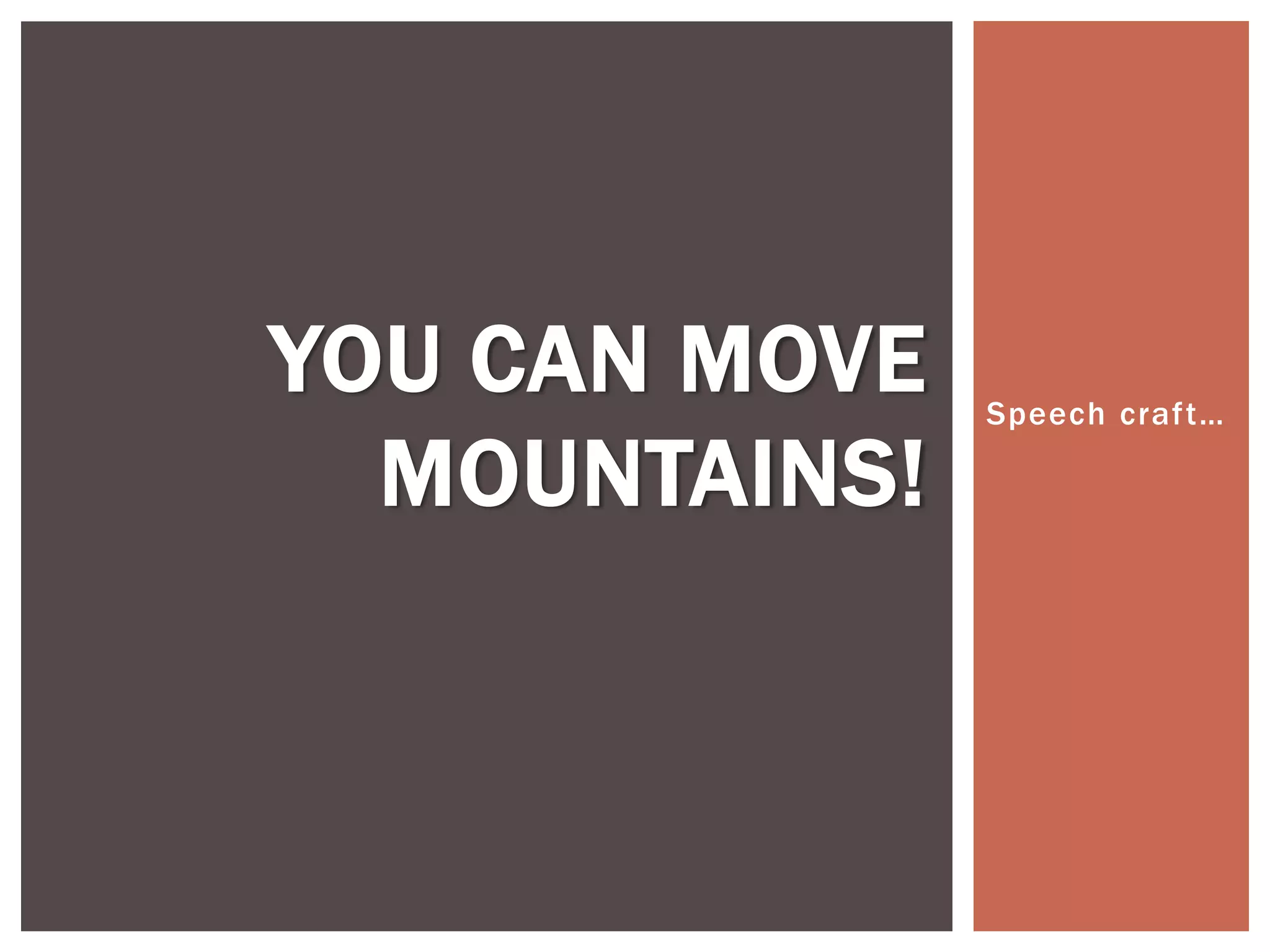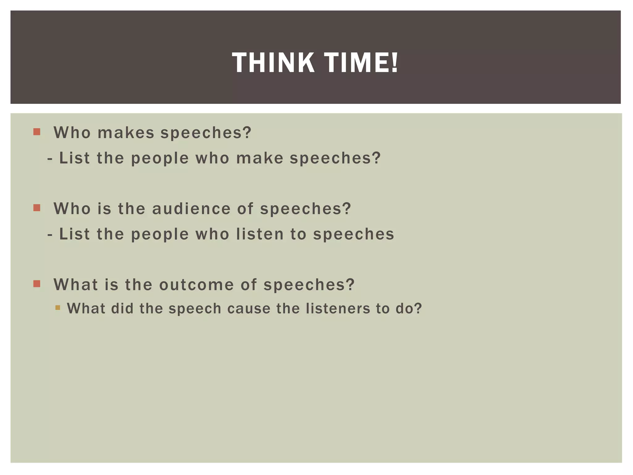 This document provides guidance on crafting effective speeches. It discusses the purpose and formats of different types of speeches, including informal speeches for everyday occasions and formal speeches intended to motivate or inspire audiences. The document outlines the typical parts of a speech, including greetings, an introduction establishing the speaker and purpose, the main content and message, and a conclusion emphasizing the speaker's desired takeaway. It also includes examples of speeches in different contexts and prompts for analyzing speech elements like tone, word choice, and literary devices.