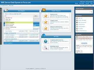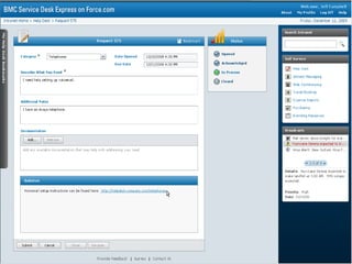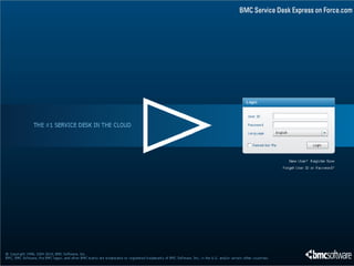 BMC Service Desk on Force.com provides IT service management on the Force.com platform including incident management, process optimization, inventory management, and self-service capabilities to reduce costs, improve quality of service, and manage risk while increasing business impact and transparency. Key features include customizable incident tracking, inventory management, knowledge search, and automated workflow.