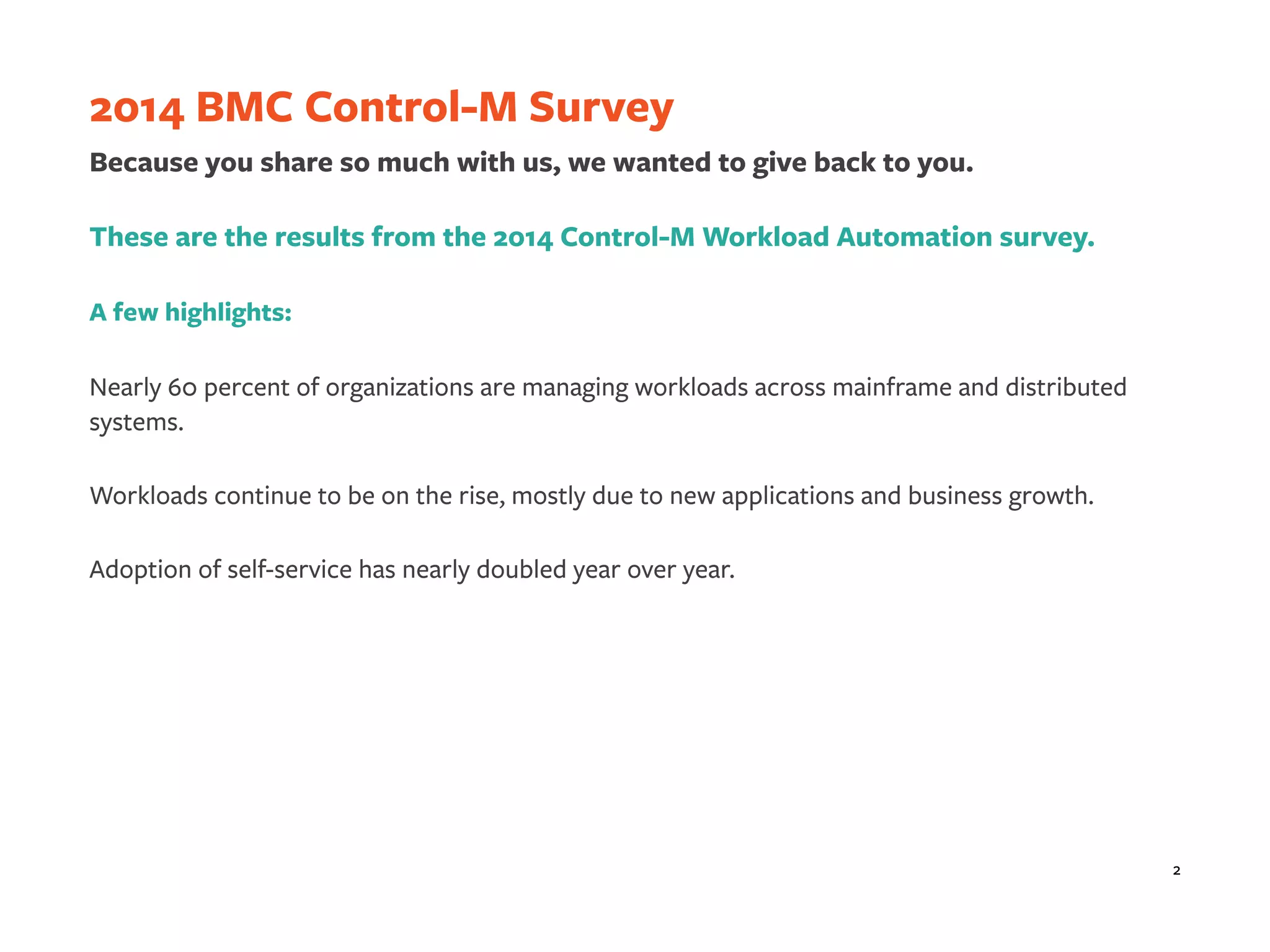 The 2014 BMC Control-M workload automation survey reveals that nearly 60% of organizations manage workloads across both mainframe and distributed systems, with a significant increase in workload due to new applications and business growth. Self-service adoption has nearly doubled year-over-year, while 70% of respondents expect capacity growth in the following year, largely driven by business growth and increased automation. Customer satisfaction with Control-M is high, with a majority expressing they are very satisfied or somewhat satisfied with the product.