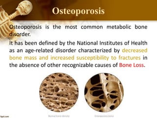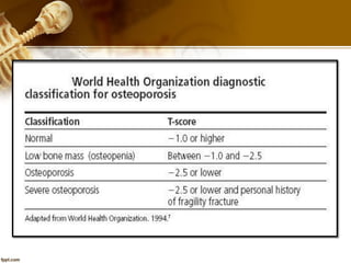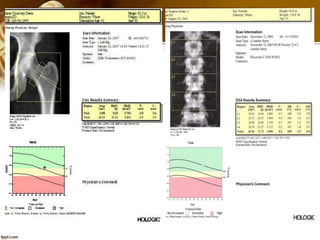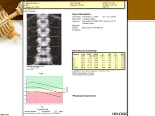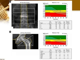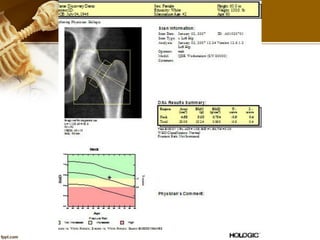 This document provides an overview of bone densitometry and osteoporosis testing. It discusses the types of tests including plain films, SPA, DPA, DXA, QCT, and peripheral tests. DXA is described as the gold standard as it is highly precise, uses minimal radiation, and can monitor changes over time. The document outlines how to perform DXA scans of the lumbar spine and hip, including proper positioning and region of interest placement. It also discusses test results reporting using T-scores and Z-scores to evaluate bone mineral density.