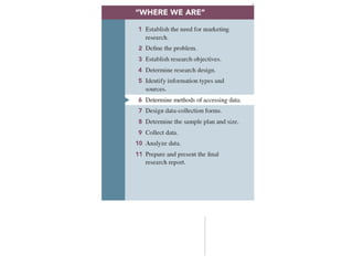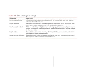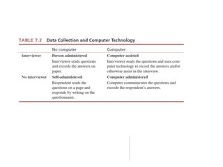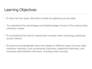 The document discusses different methods for collecting survey data, including in-person, telephone, self-administered, and mixed-mode surveys. It outlines the advantages and disadvantages of each method, such as lower costs but lower response rates for mail surveys. Researchers must consider factors like time, budget, and infrastructure when choosing the best method to fit their data collection needs.