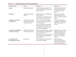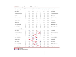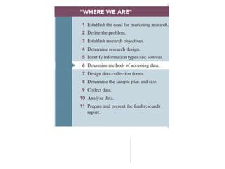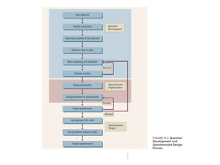 The document provides an overview of key concepts for understanding measurement, developing survey questions, and designing questionnaires for marketing research. It discusses different types of measurement scales, question formats, best practices for question wording, and considerations for organizing and coding questionnaires. The goals are to help appreciate the functions of a questionnaire, learn dos and don'ts of question design, and comprehend processes like pretesting and computer-assisted administration.
