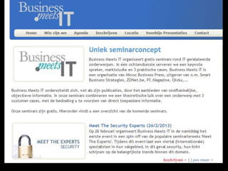 The document outlines the agenda for a seminar called "Business Meets IT – Meet The Security Experts". It will include an introduction by William Visterin, a keynote on security trends by Jean-Luc Delvaux, and presentations on next-generation firewalls by Achim Kraus, network automation security by Victor Danevich, mobile device management by Nigel Hawthorn, and WAN optimization by Filip Verloy. The event will conclude with a networking cocktail.