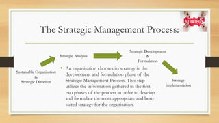 This document discusses strategic management processes and business level strategies. It provides examples of organizations using different strategies, such as Kulula Airlines using a cost leadership strategy and MiWay Insurance using a differentiation strategy. The document also outlines tests for evaluating strategies, advantages and disadvantages of different strategies, and the possibility of combining strategies.