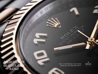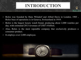 Rolex was founded in London in 1905 and is now headquartered in Geneva, Switzerland. It produces around 2,000 watches per day and had estimated revenues of $7.4 billion in 2013. Rolex has a history of innovations in watchmaking, being the first to create a waterproof wristwatch in 1926 and the first to display two time zones in 1954. The document outlines Rolex's mission, vision, objectives and marketing strategy, which includes traditional advertising methods as well as a social media presence, with the goal of educating and appealing to a younger target demographic.
