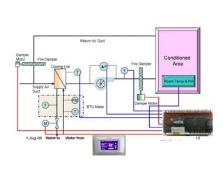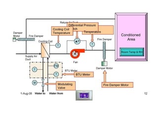 This document provides an overview of building management systems (BMS) and instrumentation basics. It discusses various inputs and outputs to BMS controllers like temperature, humidity, and pressure sensors. It describes common field devices used for sensing including thermistors, pressure switches, and flow meters. The document also covers BMS protocols, system architecture, typical components in a BMS bill of quantities, and considerations for BMS design and commissioning.