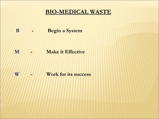 The document outlines guidelines for managing biomedical waste in hospitals. It discusses categorizing waste based on infectivity, proper segregation, collection, storage, and disposal methods. Training of staff, safety precautions, and regulatory compliance are important aspects of the waste management process. The goal is to minimize infectious waste production, safely dispose of waste, and prevent the spread of hospital-acquired infections.