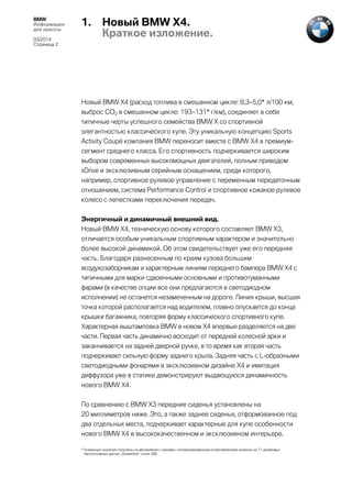 Новый BMW X4 сочетает спортивную элегантность купе с характеристиками SUV и предлагает широкий выбор мощных двигателей с технологией BMW EfficientDynamics для минимального расхода топлива и низких выбросов CO2. Он оснащен современными системами помощи водителю и информационно-развлекательными технологиями BMW ConnectedDrive. Автомобиль обеспечивает высокую динамику и комфортный интерьер с уникальными дизайнерскими элементами, что делает его лидером в премиум-сегменте среднего класса.
