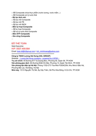 Công ty Lương Hải Hưng (H2L Group) cung cấp các loại bồn lắp ghép bằng vật liệu composite, thép mạ kẽm, inox và thép sơn epoxy, sử dụng cho chứa nước sinh hoạt và chữa cháy. Sản phẩm có tính năng nhẹ, dễ lắp ráp và không bám rong rêu, bảo hành 5 năm. Công ty cũng cung cấp nhiều sản phẩm khác như bồn chứa nước sạch, hóa chất, tự hoại, cùng bộ lọc tách mỡ.