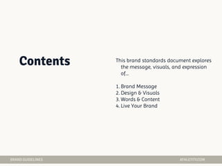 This brand standards document explores the messaging, visuals, and expression of Athletity, a physical therapy and performance lab. The document provides guidelines on the brand message, design and visuals, wording and content, and how to embody the brand. It establishes that the brand aims to empower clients and make them feel like a valued teammate on their journey to peak physical performance. The document also provides direction on colors, fonts, imagery, and tone of voice to maintain a consistent brand identity.