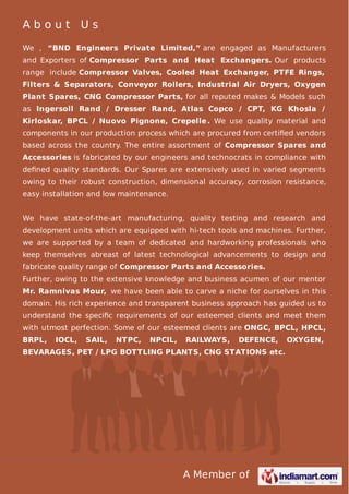 BND Engineers Private Limited is an ISO 9001-2008 certified company that manufactures and exports compressor parts and heat exchangers. They produce products like compressor valves, cooled heat exchangers, PTFE rings, filters, separators, and parts for compressors from manufacturers like Ingersoll Rand, Atlas Copco, Kirloskar, and others. BND has modern manufacturing facilities and supplies parts to major clients in sectors like oil and gas, power, metals, and more. They were established in 1994 and have up to 10 employees.