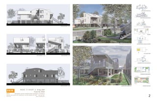 This document describes the design of a sustainable housing project based on traditional Creole cottages in New Orleans. Key features include a main three-bedroom unit at the front and a one-bedroom rear unit that can be combined or used separately. The raised structure is set back to optimize solar orientation around a central courtyard. Natural cross ventilation and stack effect ventilation are maximized using room layouts, high windows, and sloped ceilings. Rainwater is collected and reused for irrigation and plumbing, while stormwater is managed through swales and rain gardens. Construction uses prefabricated structural insulated panels for efficiency, and sustainable materials provide a highly insulated building envelope.