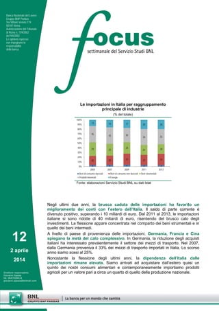 Negli ultimi due anni, l'Italia ha visto un miglioramento dei conti con l'estero grazie alla diminuzione delle importazioni, che hanno registrato un calo di 40 miliardi di euro, principalmente a causa della riduzione degli investimenti. Nonostante il saldo di parte corrente sia diventato positivo, la domanda interna rimane debole, evidenziando la dipendenza dell'Italia dalle importazioni, in particolare nei settori agricolo e dei beni strumentali. La sfida per l'Italia è stimolare i consumi e affrontare le disuguaglianze economiche, accompagnando le misure di crescita con riforme strutturali.