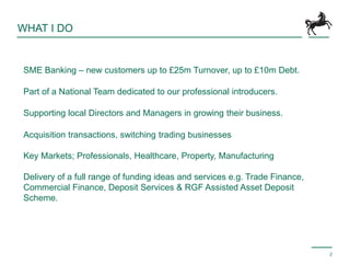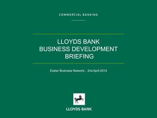 Lloyds Bank's business development briefing highlights their commitment to supporting SMEs with up to £25m turnover, showing growth with over £1bn sanctioned in 2013. The bank promotes year-on-year growth in advances, provides business seminars, and offers resources for business guidance, maintaining a reputation as the 'best business bank' for nine consecutive years. Their focus on client satisfaction and support culminates in an experienced turnaround team to help businesses navigate economic challenges.