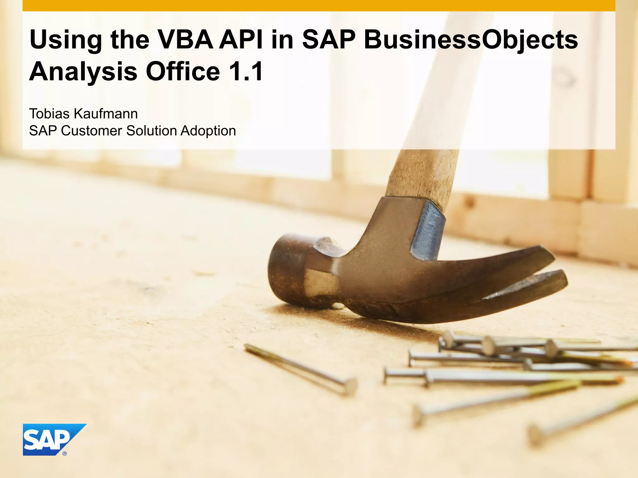 This document provides an overview of using the VBA API in SAP BusinessObjects Analysis Office 1.1. It discusses using the API to build sophisticated BI workbooks, call formulas within cells, get and show information, and set filters using macros. The document then provides code samples for enabling the Analysis Office add-in, refreshing data, creating a drill-down button using cell context information, setting filters with combo boxes, and creating a dynamic grid. All code samples are available for download from a shared link. The document serves as an introduction for developers on using the Analysis Office VBA API.