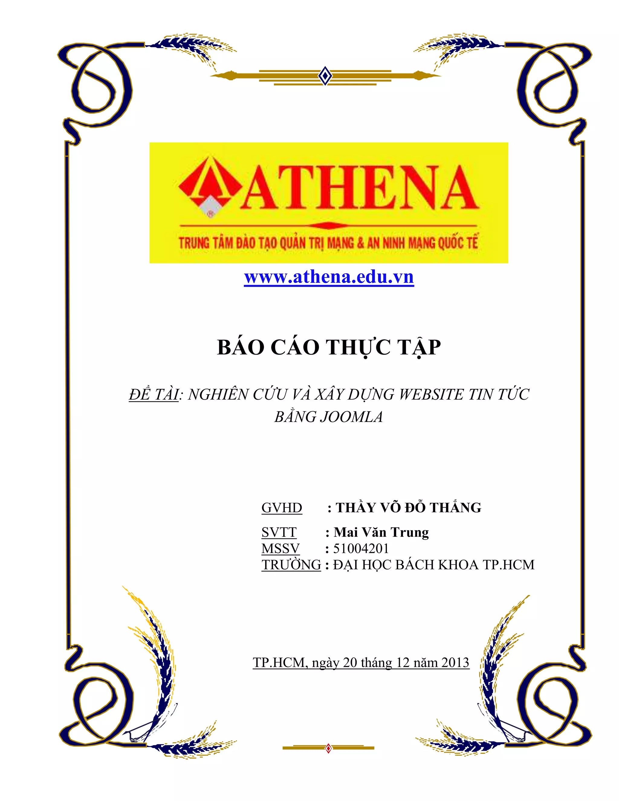 Báo cáo thực tập của sinh viên Mai Văn Trung tại trung tâm Athena giới thiệu về việc xây dựng website tin tức bằng Joomla, nhằm kết nối lý thuyết học được với thực tế. Trung tâm Athena chuyên đào tạo quản trị mạng và an ninh mạng, cung cấp môi trường học tập hiện đại và hỗ trợ sinh viên phát triển kỹ năng chuyên môn. Tài liệu cũng nêu rõ quy trình cài đặt và cấu hình website sử dụng Joomla và XAMPP.