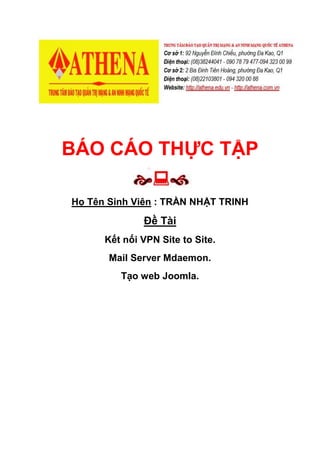 Báo cáo thực tập mô tả quy trình kết nối VPN site to site, thiết lập mail server MDaemon và tạo web Joomla. Tài liệu nêu rõ các bước thực hiện, định nghĩa VPN, mục đích của nó, cũng như cách cài đặt các dịch vụ liên quan trên hệ thống máy chủ. Các kết quả cuối cùng cho thấy khả năng chia sẻ tệp giữa hai máy khách đã được thiết lập thành công.